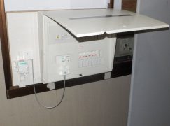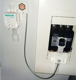 分電盤に取り付けて、ばねの作動やおもりの落下によりブレーカーを切ることで、通電を遮断します。