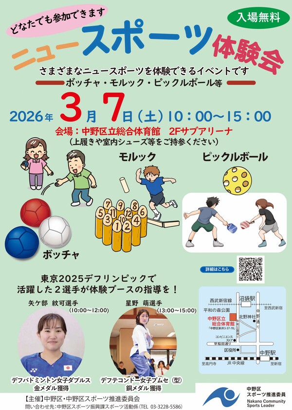 中野区立総合体育館にて、誰でも楽しめる「ニュースポーツ」の体験会を実施します。この機会に、話題の競技を体験してみませんか。