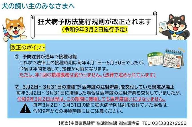 例年、3月2日から3月31日に狂犬病予防注射を接種をされている方は、令和9年3月2日に「狂犬病予防法施行規則」の改正が予定されていますので、令和9年の接種時期にはお気をつけください。