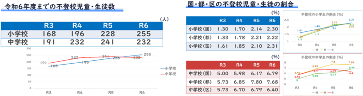 不登校児童生徒数は、令和6年度は255人に増加しています。一方、中学校においては令和5年度までは増えておりましたが、令和6年度は減少し、232人になっています。