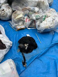 (写真は左から、火元確認のためごみ収集車からごみを開けている様子、発見時のモバイルバッテリー、水につけ鎮火したモバイルバッテリー)