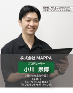 小川:別の会社でしたが、アニメ業界が肌に合うと感じました。1年ほど経験を積んだ頃、マッドハウス創業者の丸山さんがMAPPAを立ち上げたと聞き、「ここだ!」と思って入りました。