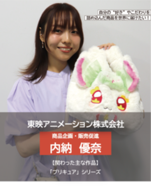 内納:もともと、自分の好きなコンテンツのグッズを買うことがすごく楽しくて。もうすぐ新商品の発売日があるから頑張ろう、と日常の活力になっていたんです。大好きなプリキュアのキャラクターグッズを作って、誰かの日常に少しでもときめきを与えられたら...と思い入社しました。