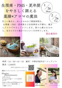 - 1月26日(月曜)Hugme さとうみわ『生理痛・PMS・更年期をやさしく調える薬膳×アロマの魔法』