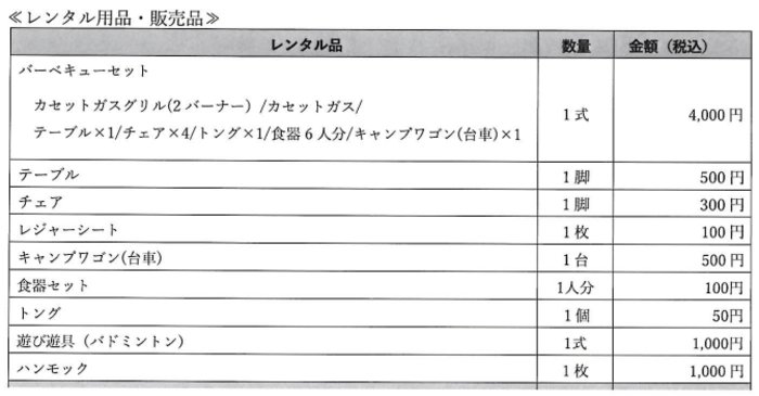レンタル用品・販売品(バーベキューサイト利用案内より引用)