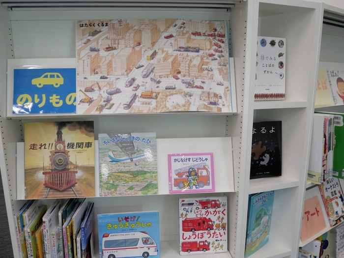 低めの本棚が並んでいるので、子どもが自分で絵本を取って選べます。お気に入りの1冊が見つかるかもしれません。