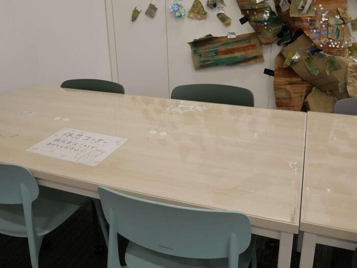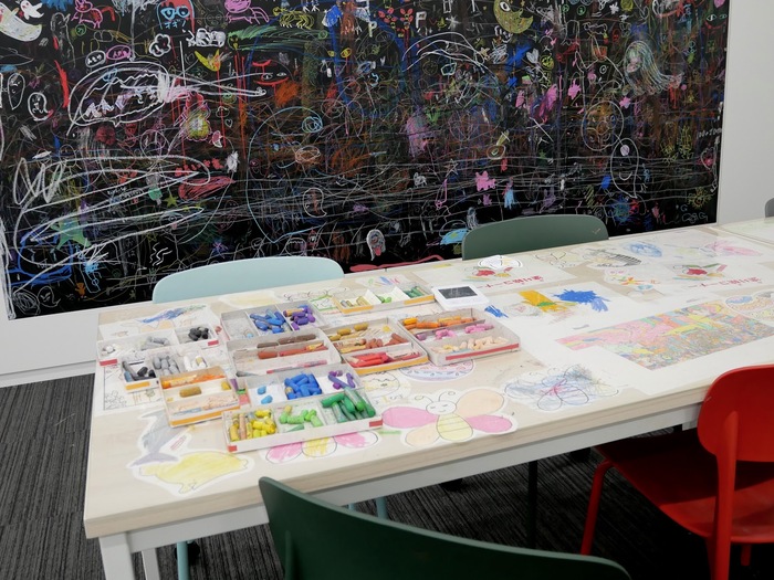 こちらのスペースでは、子ども向けの工作教室や科学教室などのワークショップも行われるそうです。この日は、色とりどりのクレヨンでお絵描きを楽しみました。