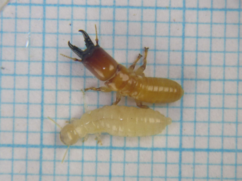 イエシロアリの兵アリ(2頭)と働きアリ(3頭)