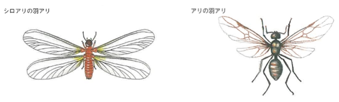 シロアリは名前や形、大きさ、生活様式などがアリに似ていますが、アリとはまったく違った種類の昆虫で、アリの仲間ではありません。アリは人に大きな損害をあたえませんが、シロアリは木材を食い荒らす、おそるべき害虫です。そこで、一般の方も自宅にいる「アリ」がシロアリではないか識別できることが必要です。