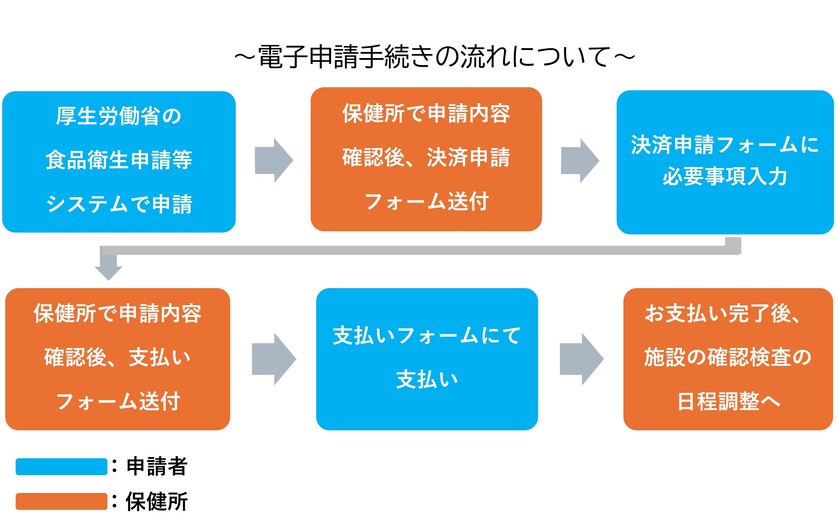 厚生労働省の食品衛生申請等システムから電子申請していただいた後、保健所で申請内容を確認し、問題なければ申請者様宛に決済申請フォームをお送りします。決済申請フォームに必要事項を入力していただいた後、再度保健所で申請内容を確認し、支払いフォームをお送りします。こちらから支払いを完了させてください。支払いを確認後、申請手続き完了となります。