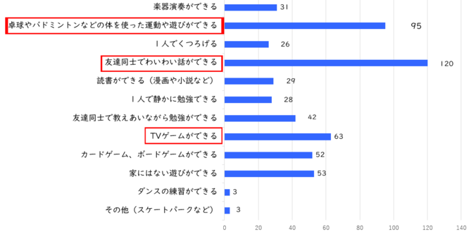 最も多かったのが「友達同士でわいわい話ができる」で120件、続いて「卓球やバドミントンなどの体を使った運動や遊びができる」が95件、「TVゲームができる」が63件という結果となりました。