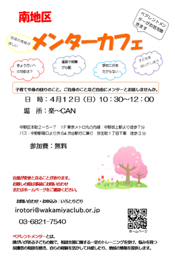 | 会場 | 沼袋区民活動センター | 桃園区民活動センター | わかみやクラブフリースペース (沼袋1丁目2番7号) | |
