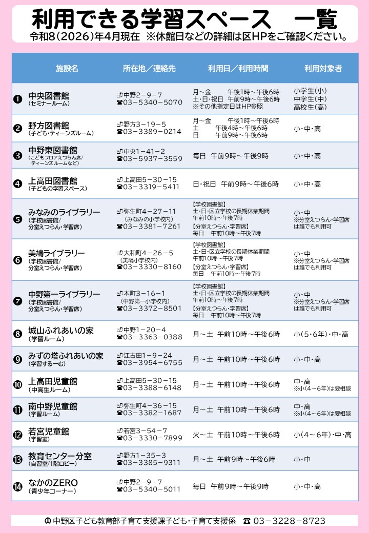 | (学習室) | 中野区若宮三丁目54番7号 03-3330-7899 | 火曜~土曜(日・月曜、祝日、年末年始を除く) 午前10時~午後6時(正午~午後1時を除く) | 小学生(4~6年生) 中学生 高校生 | 10席程度 | 有 |