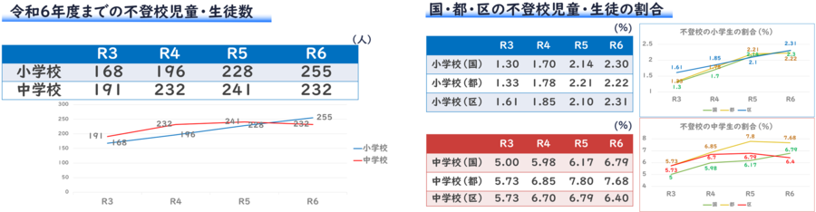 不登校児童生徒数は、令和6年度は255人に増加しています。一方、中学校においては令和5年度までは増えておりましたが、令和6年度は減少し、232人になっています。