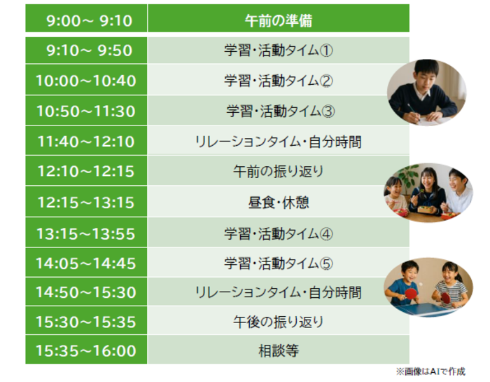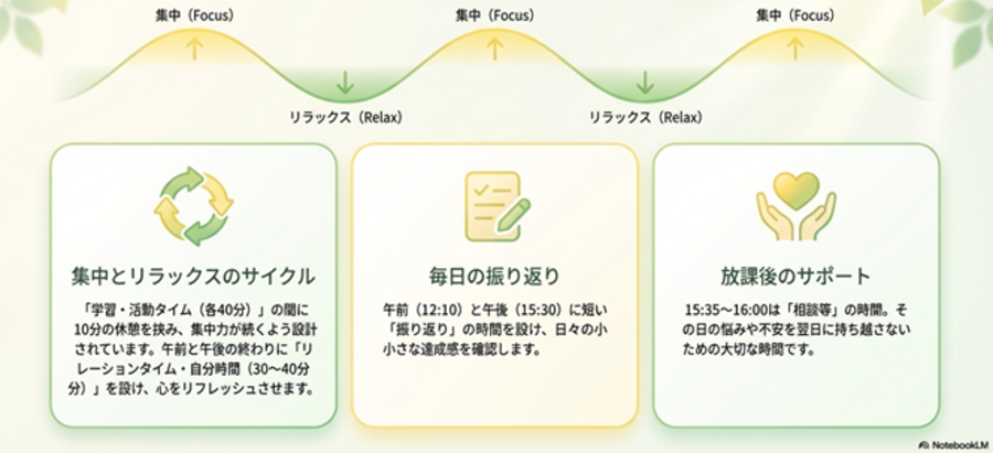 生活リズムを大切にしながら、学習と活動、休憩をバランスよく配置しています。