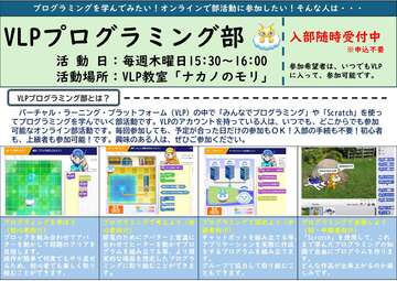 VLP(バーチャル・ラーニング・プラットフォーム)の中で「みんなでプログラミング」や「Scratch」を使ってプログラミングを学んでいくオンライン部活動です。