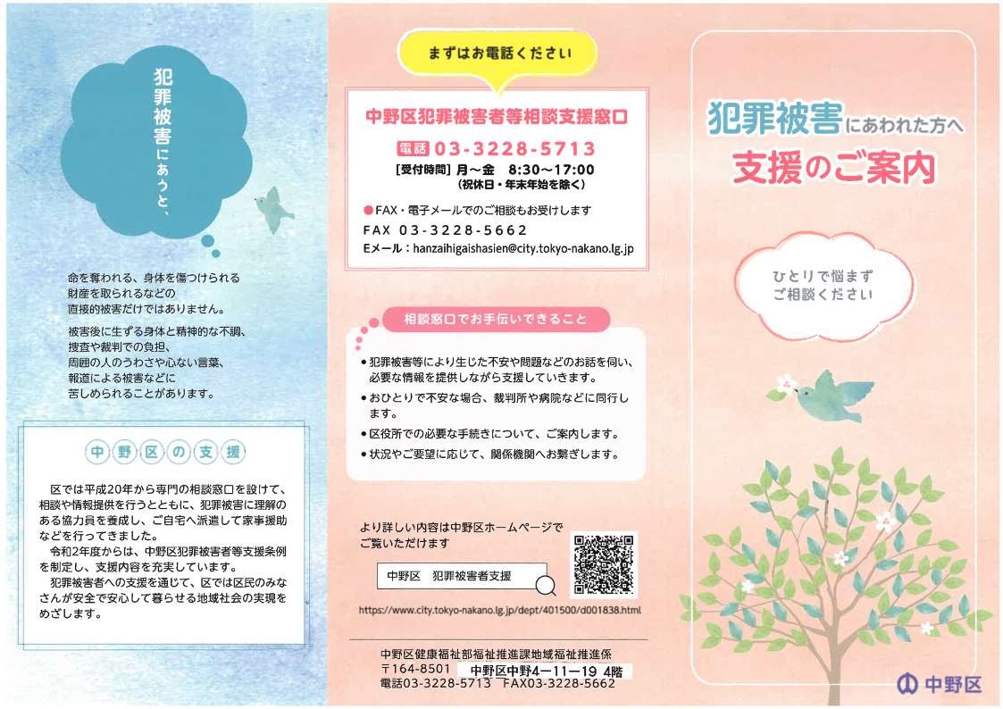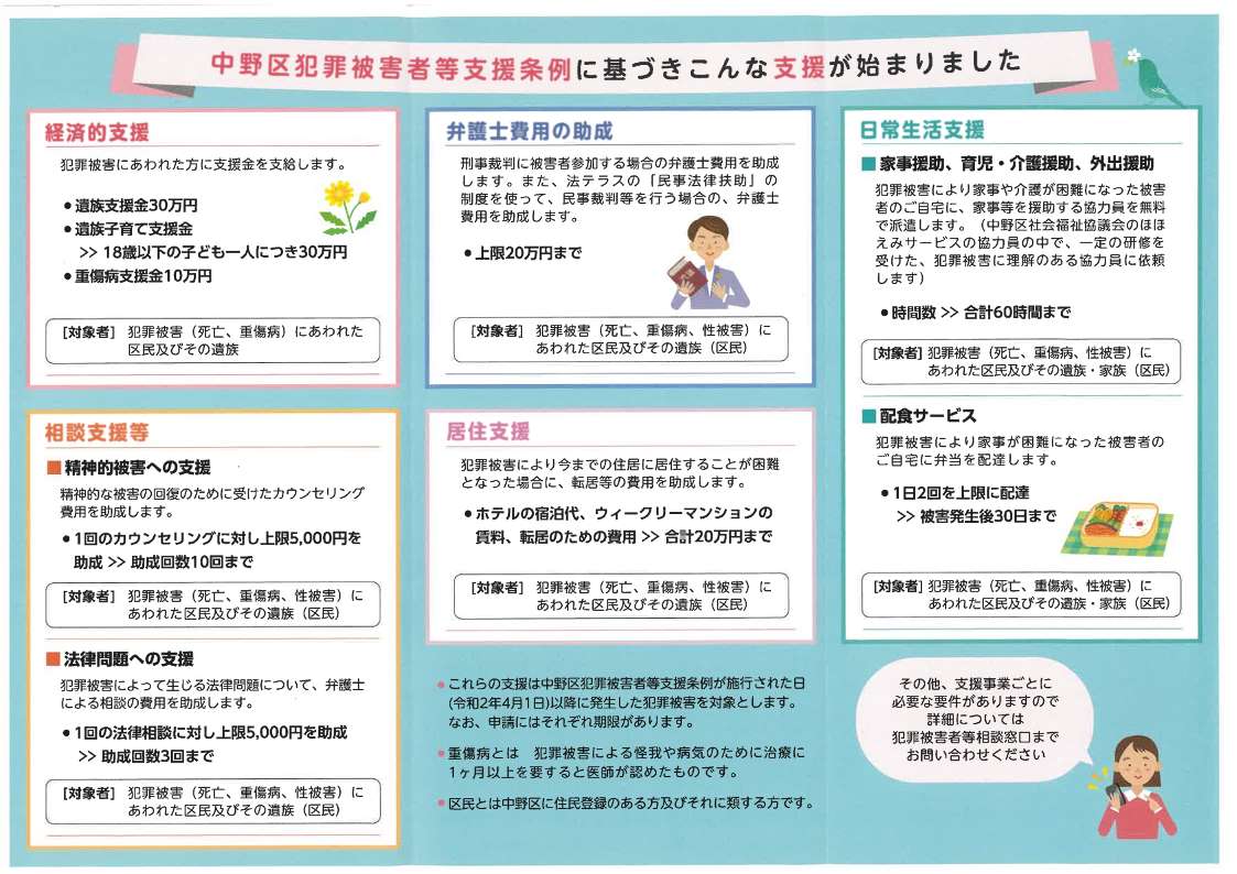 令和2年度からは、「中野区犯罪被害者等支援条例」を制定し、支援内容を充実しています。