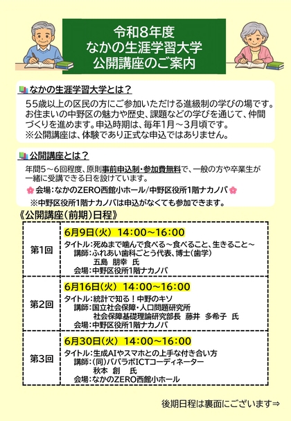 令和8年度なかの生涯学習大学では年間6回、原則事前申込制・参加費無料で、一般の方や卒業生が一緒に受講できる日を設けています。