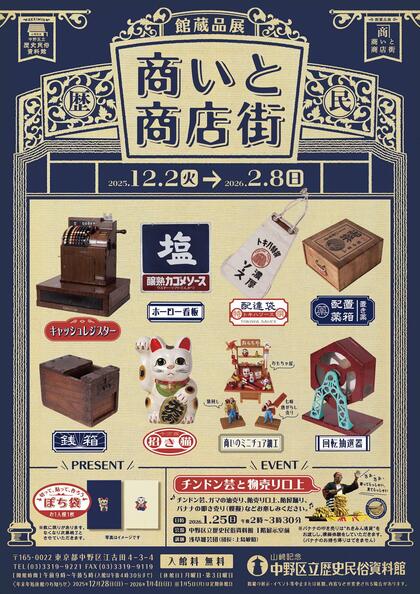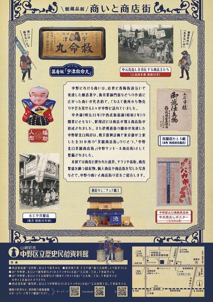 本展では商売に使われた道具、チラシや看板、商売繁盛を願う縁起物、個人商店や商店街を写した写真などで、中野の商いと商店街の姿をご紹介します。