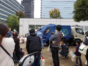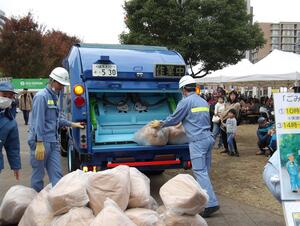 「ごみのんカーの積込実演」では、たくさんの方が集まり、説明を聞きながら積み込みの様子を真剣に見ていました。会場には「ごみのん」も登場し、子どもたちが握手したり写真を撮ったりと盛り上がりました。