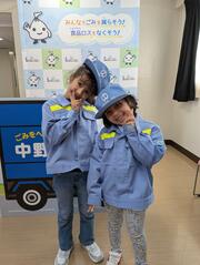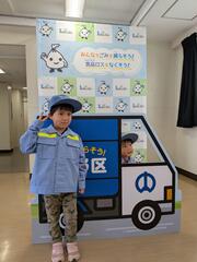 (写真は左から、ごみ収集の作業員さんの制服を着て記念撮影、分別パズルに挑戦する様子)