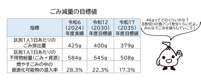 区を取り巻く様々な状況を踏まえ、さらなるごみの減量を目指し「第5次一般廃棄物処理基本計画」を策定しました。この計画は、毎日の生活から排出されるごみ(一般廃棄物)について、区の清掃・リサイクル事業の指針となるもので、令和3年9月に策定した前計画を踏まえた新計画になります。基本理念として「持続可能な循環型ごみゼロ都市」を目指します。この理念のもと、2035年度までの10年間で、区民1人1日あたりのごみ排出量を「46g」減らすことを目標としています。詳しくは「第5次中野区一般廃棄物処理基本計画の策定について」をご覧ください。